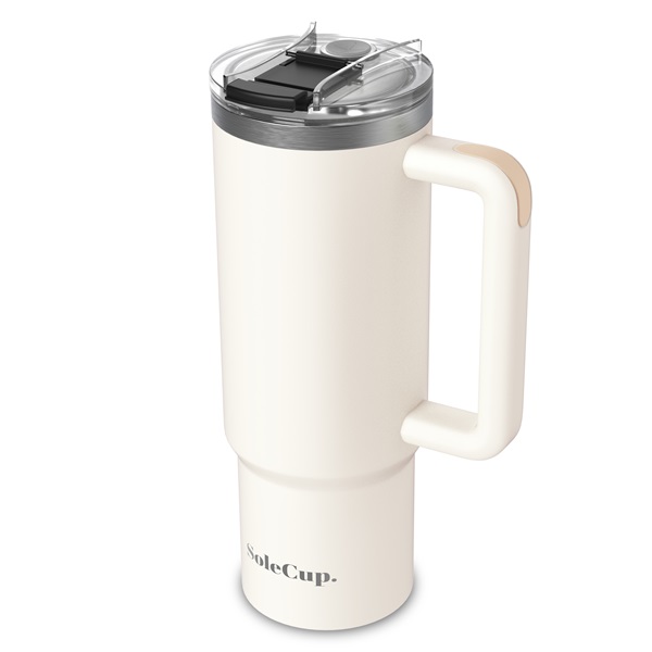 A: The SoleCup travel mug can keep drinks hot for up to 8 hours and cold for up to 24 hours, thanks to its double-walled stainless steel construction.